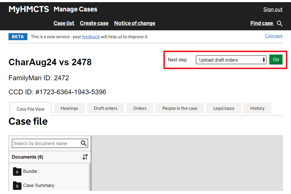 1. Open the case and select ‘Upload draft orders’ from the next step dropdown menu. Then select ‘Go’.