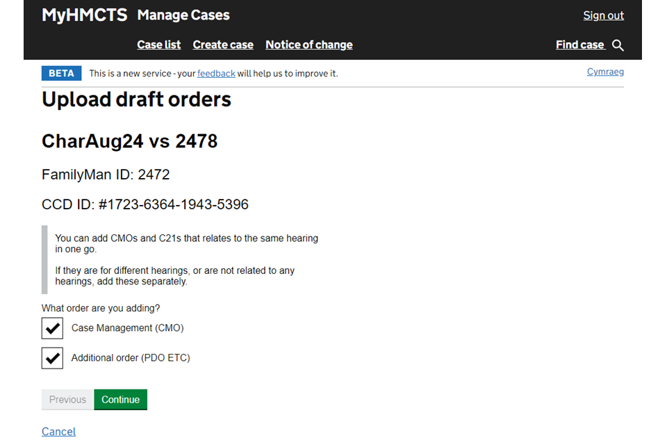 2. Select the relevant order then ‘Continue’. If you have more than one order that relates to the same hearing, tick both case management and additional order.