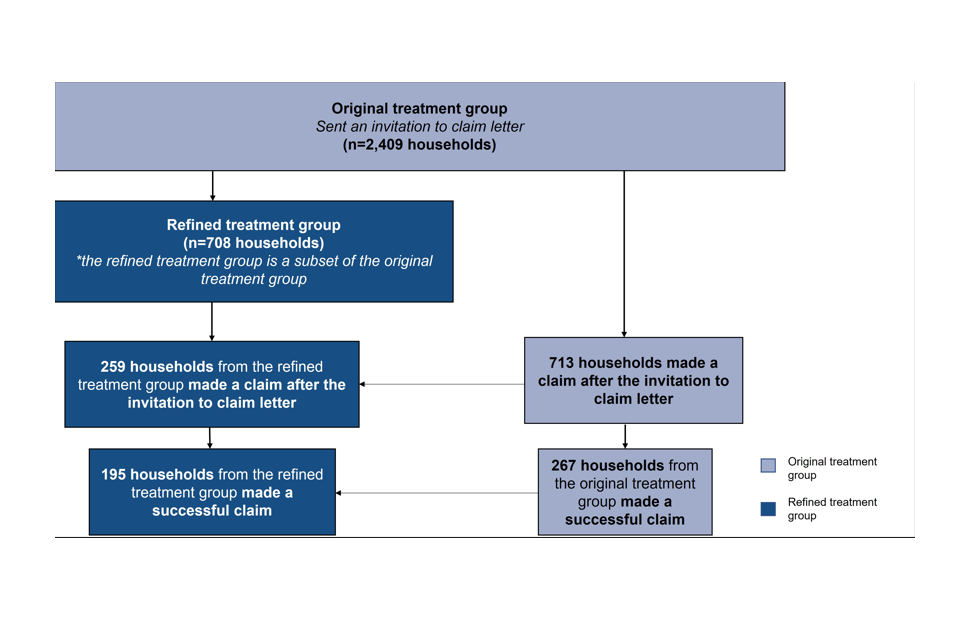 There were 267 households from the original treatment group that made a successful claim to PC; this is higher than the 195 successful claims in the refined treatment group. These 72 households were not included in the refined treatment group. This is because based on the refined criteria, they were not entitled to PC at the start of the exercise. In the period following the letters these households had a change of circumstance, meaning that when they made a claim for PC they were subsequently entitled. These 72 successful claims have been counted towards the original treatment group. This is explained further in the quantitative results section of the report. ↩