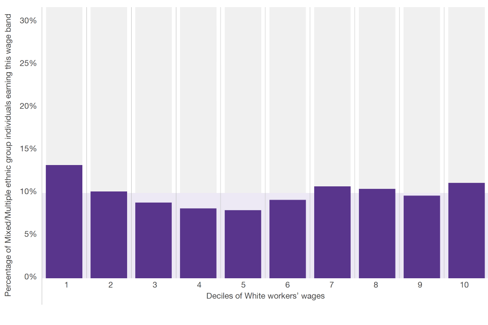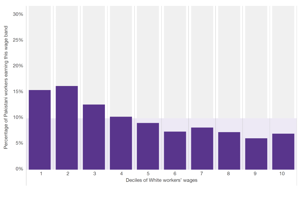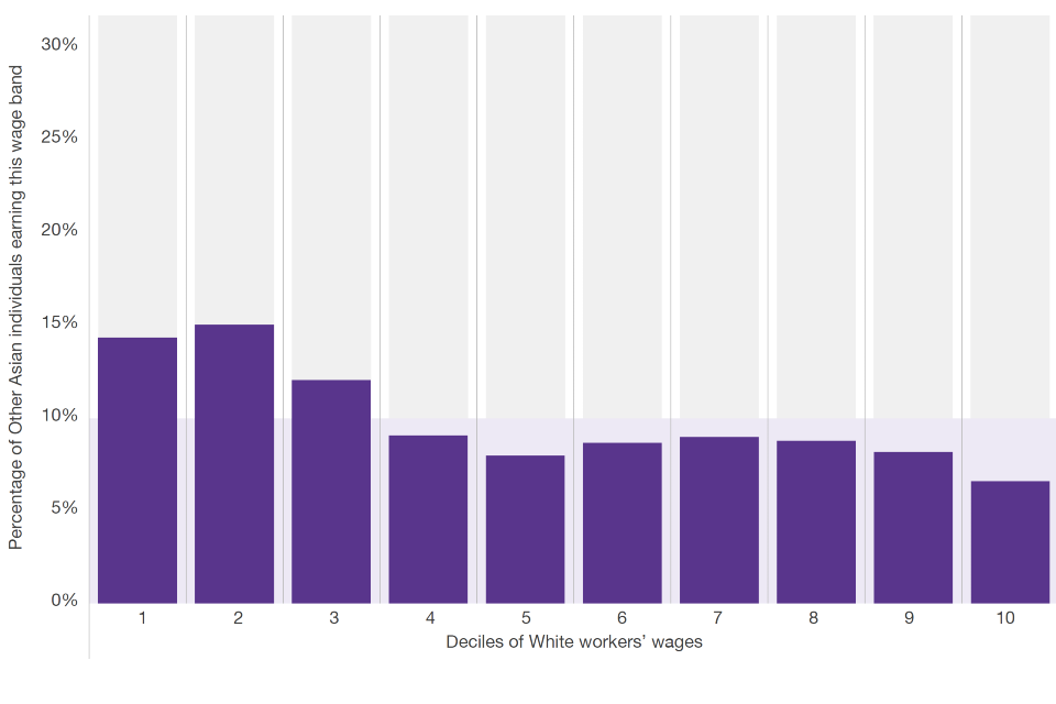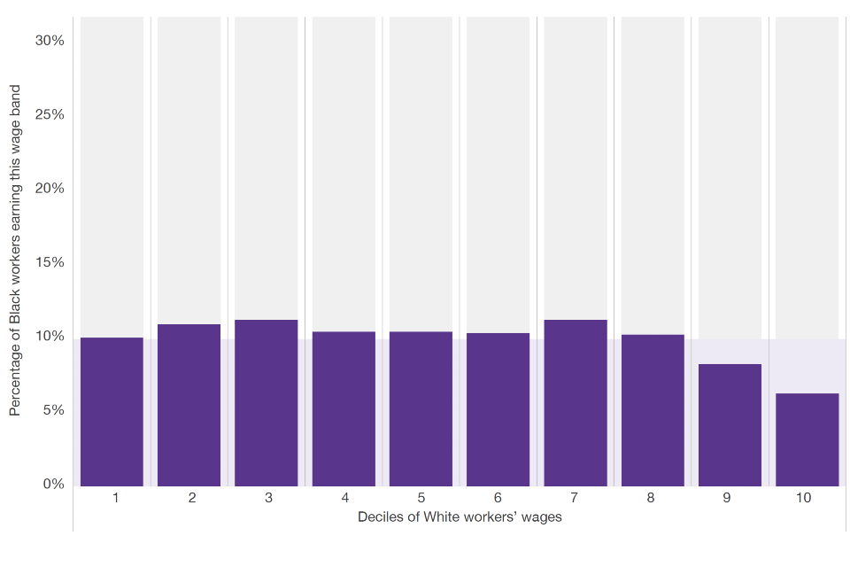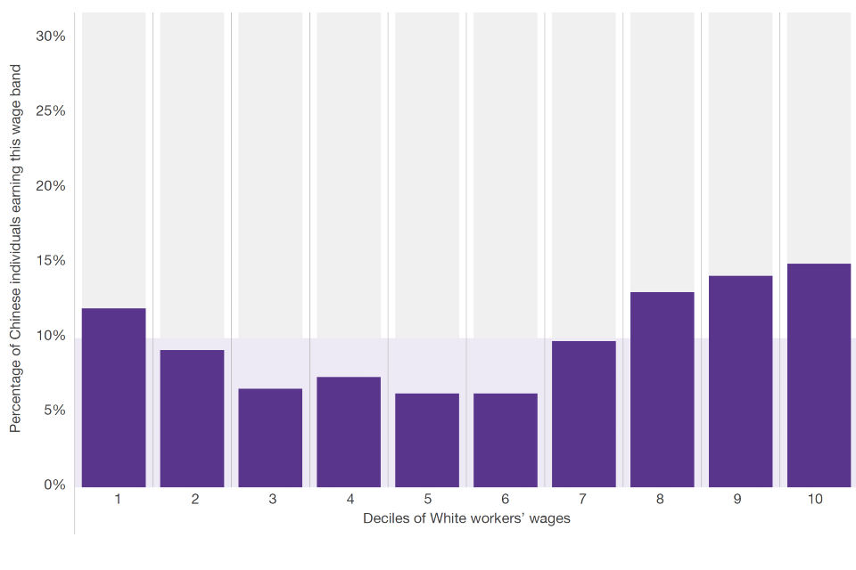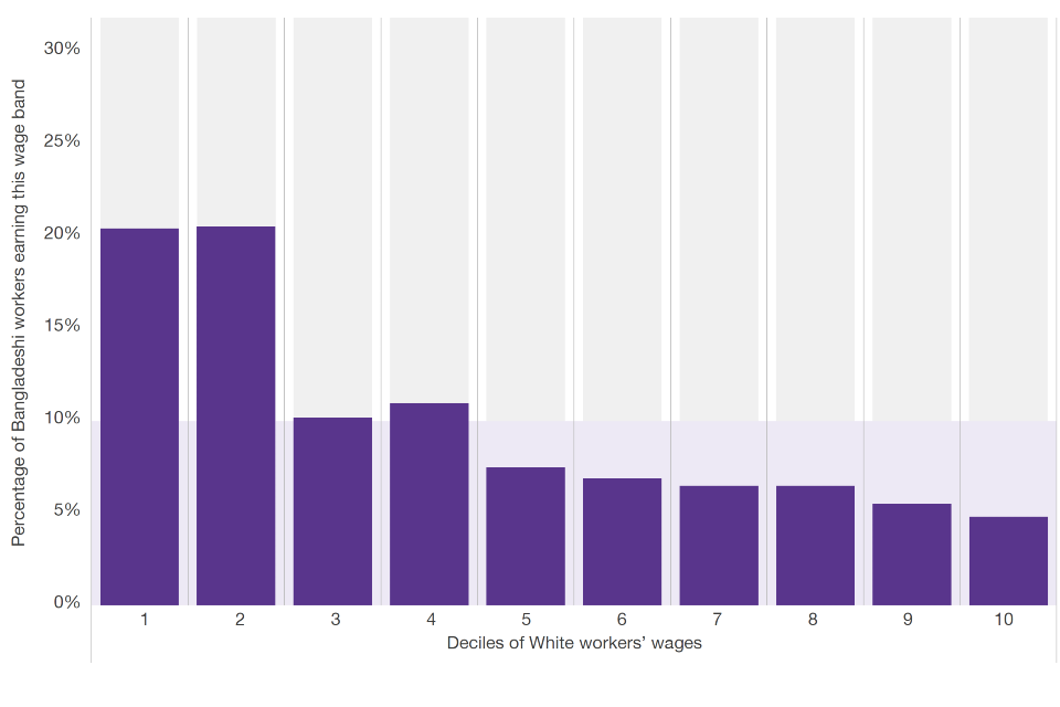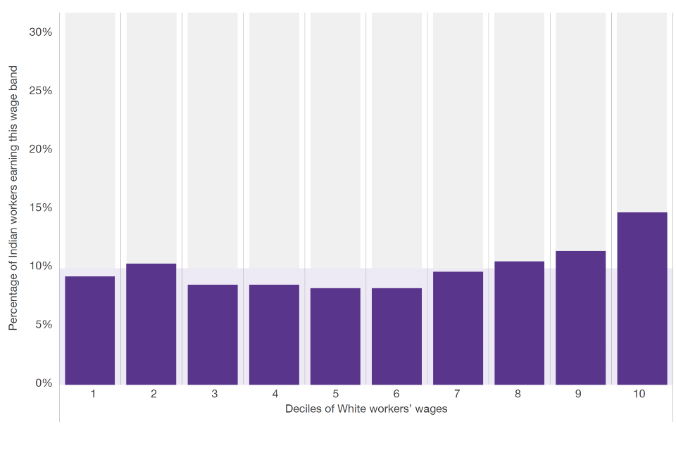 Based on work by Ken Clark, University of Manchester. The x-axis gives the cut-off wages that result from decomposing the wage distribution of the White population into 10 equal parts, meaning 10% of White workers earn wages in the first decile. The y-axis denotes the percentages of an ethnic group located in those same wage percentiles. If the wage distributions of ethnic minority and White workers were exactly equal, then 10% of minority workers would be located in each wage percentile, and the purple bars would match the mauve box. ↩