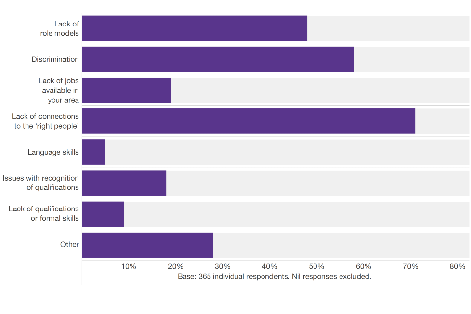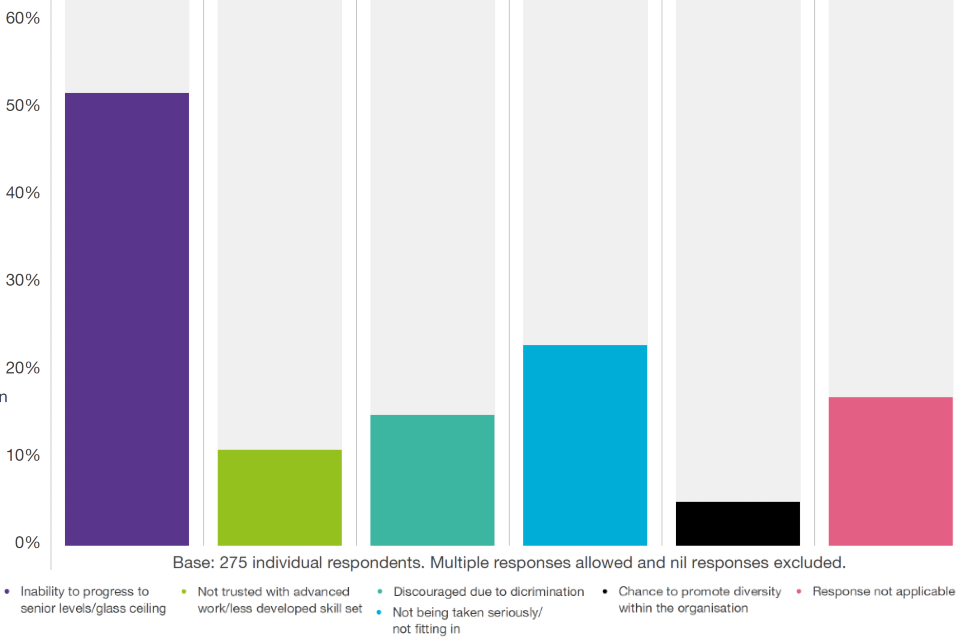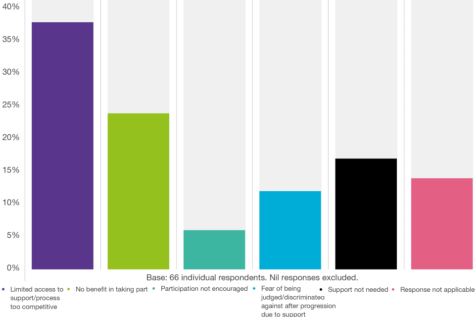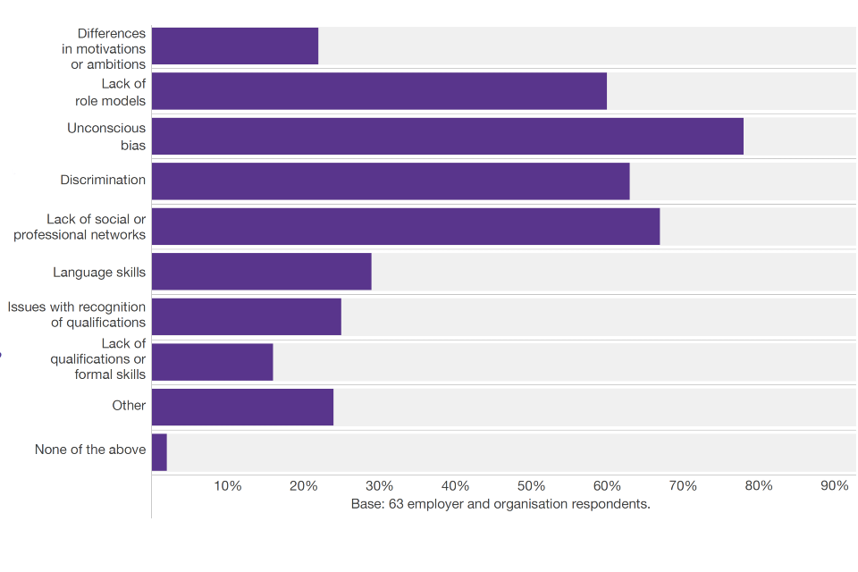 An overwhelming majority (90%) of staff felt they had faced barriers to promotion. Half (50%) said they had not been fully informed of the process for applying for promotion, and three-fifths (59%) reported that senior managers and colleagues had not supported them to progress their career;
