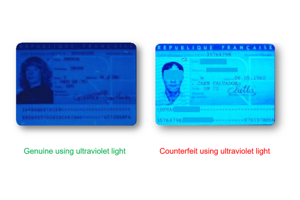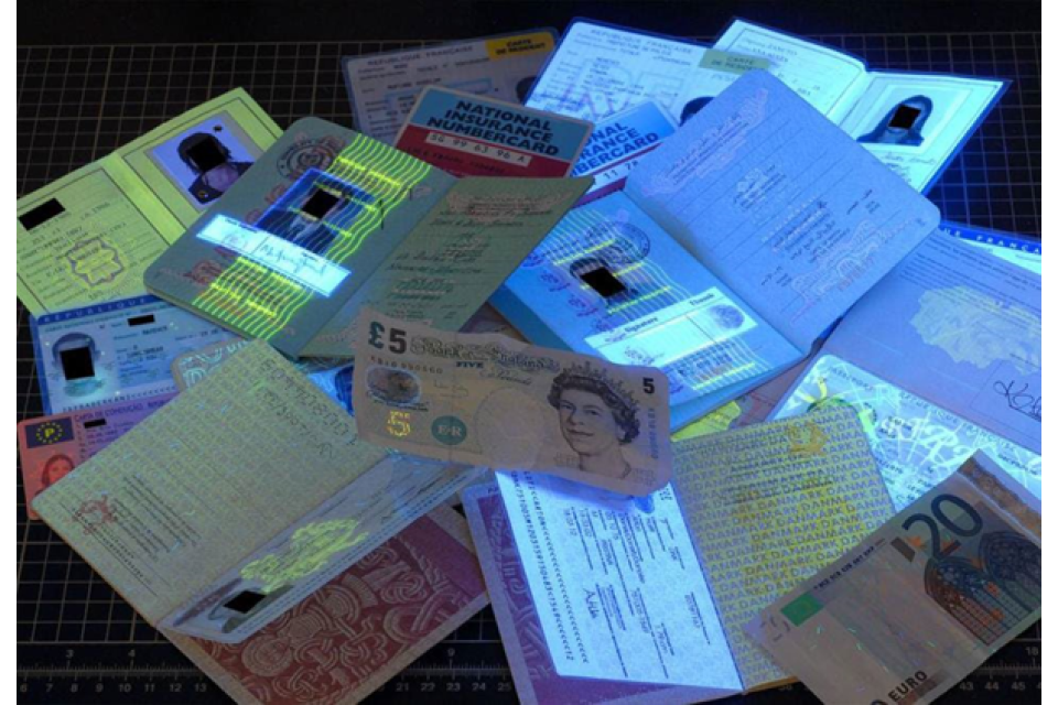 Using ultraviolet (UV) light you can see counterfeit documents that fluoresce (shine) more brightly than genuine documents which use dull, secure paper/material.