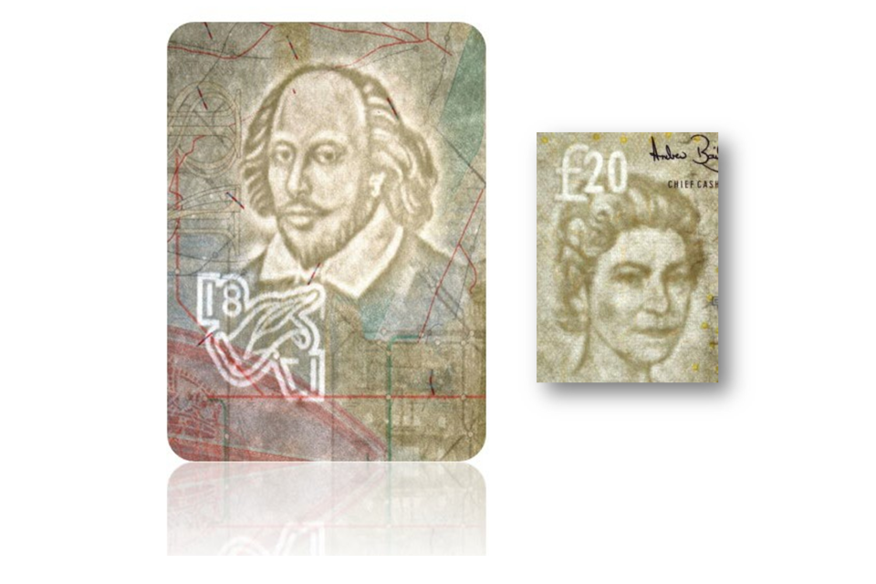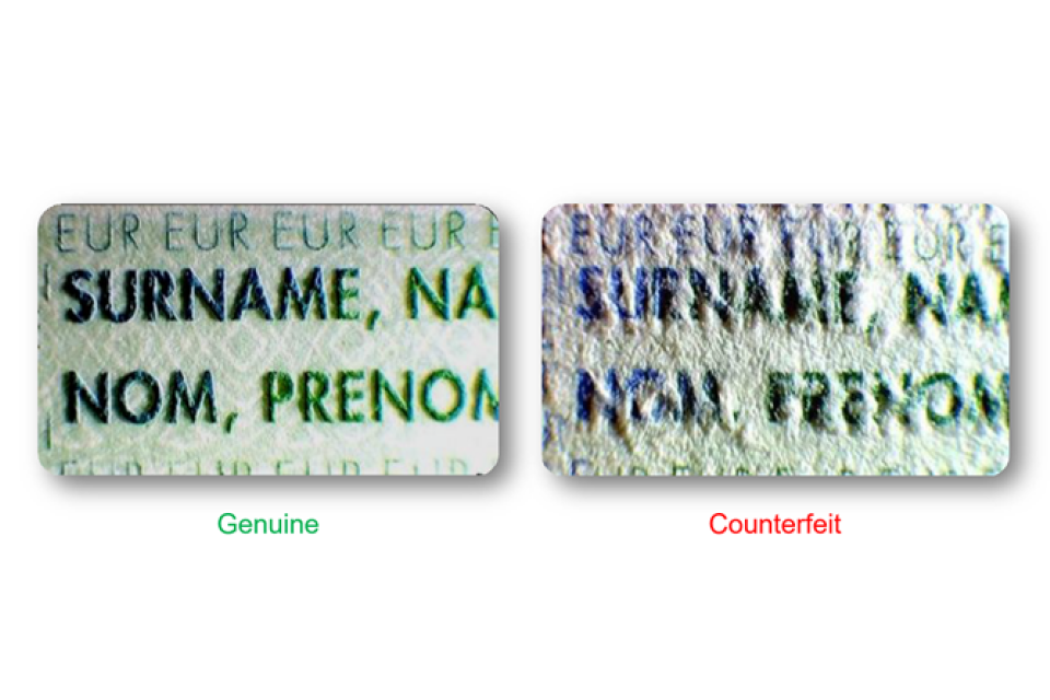 Genuine intaglio printing will have raised print which can be identified by touch. In contrast the counterfeit document on the right does not have raised print.