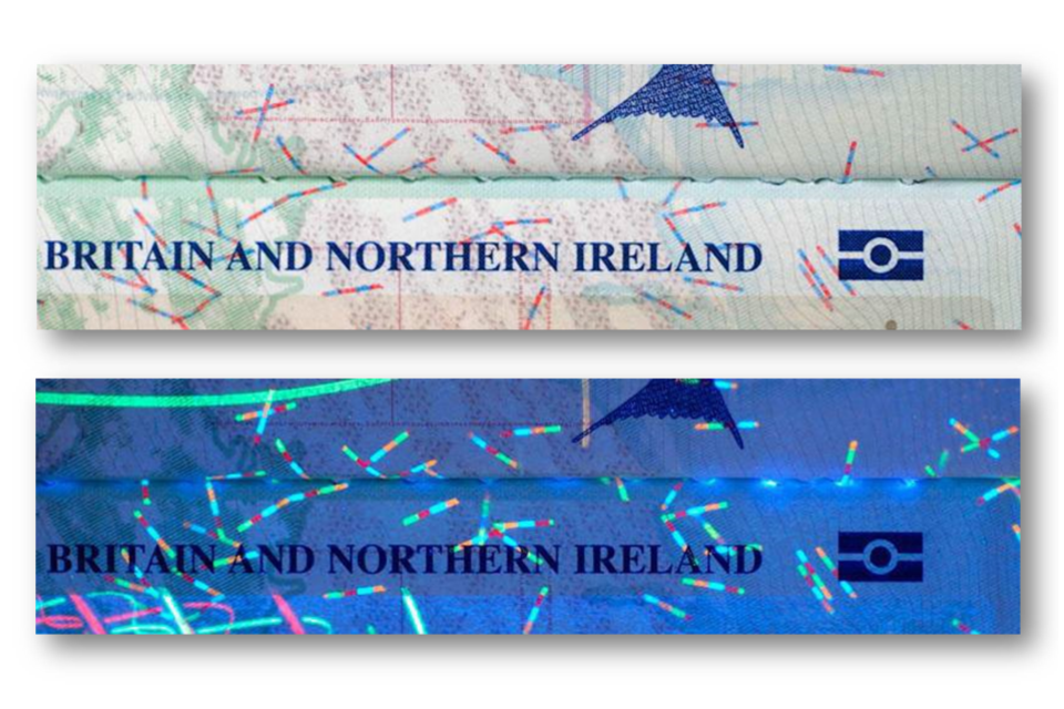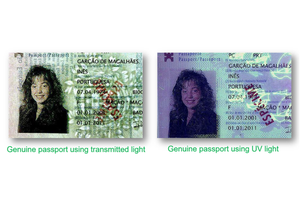 Shows how a genuine passport should look using transmitted light and UV light.
