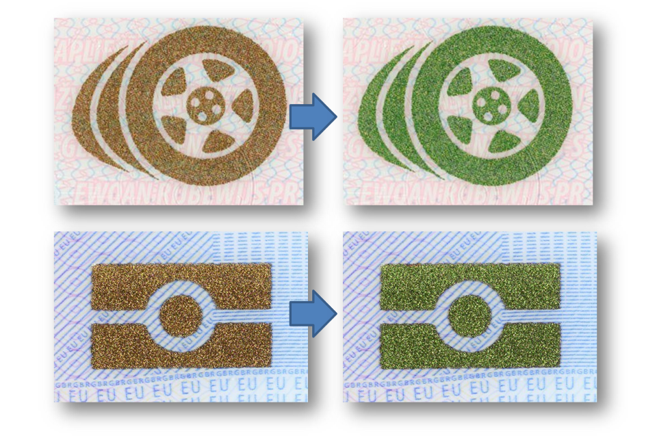 Optically variable ink - move the document under a light source (Yes/No)