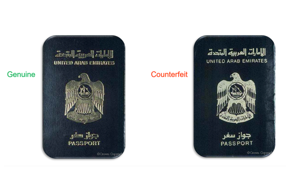 Image comparing two United Arab Emirates passports. One which is genuine and the other which is a counterfeit.