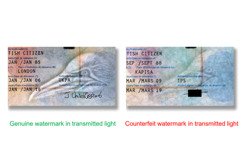 Nearly all passports contain watermarks (some paper based identity cards also have one). When light is shone through the page the genuine watermark (left) has subtle variations in the light and dark areas (thinner or thicker areas of paper), unlike the counterfeit (right) which has been printed onto the surface.