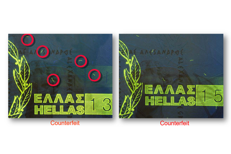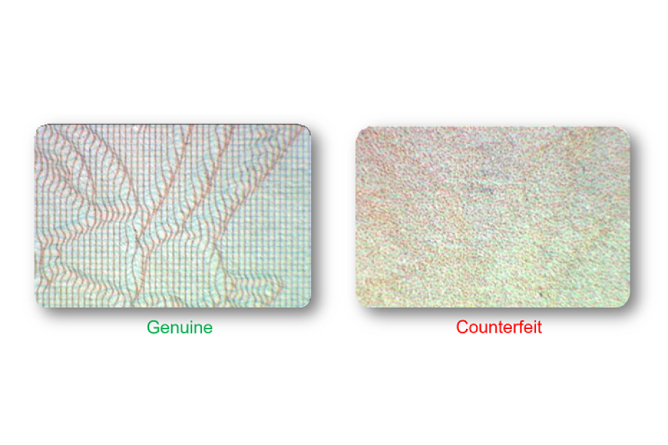 The difference between laser engravings on a genuine and counterfeit image.