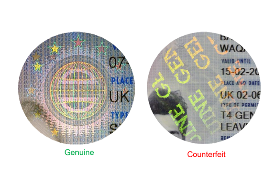 Many documents have holographic devices which are highly detailed and display different colours and designs when rotated and tilted. The counterfeit document below has a generic hologram with the word GENUINE in it.