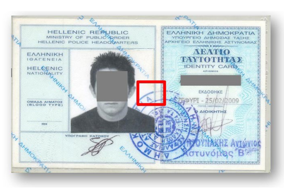Forged Greek ID card with ink stamp highlighted.