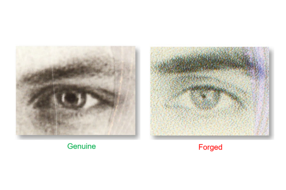 Genuine intaglio printing compared to counterfeit version.