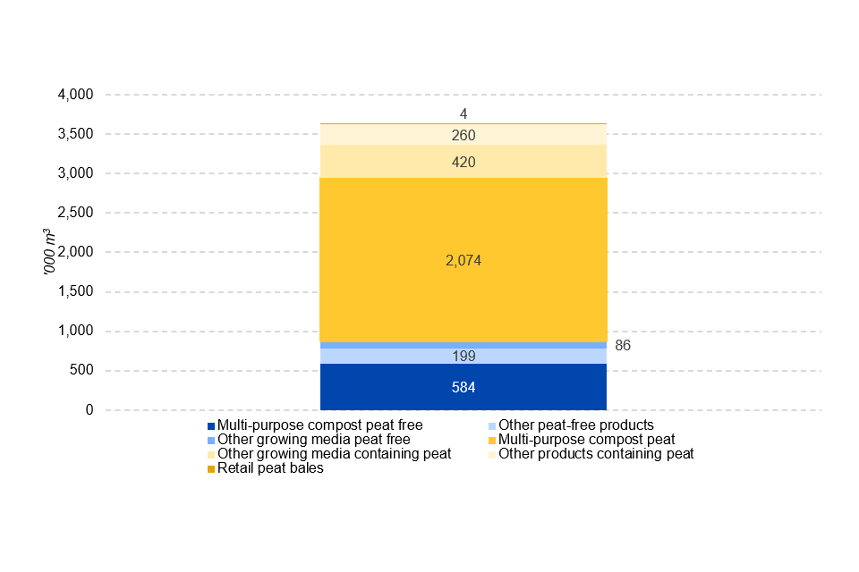 Growing media accounts for goods such as multi-purpose compost, specific mixes and grow bags. ‘Other retail products’ include items such as soil improver and tree planting mixes. ‘Retail peat’ refers to peat bales. ↩