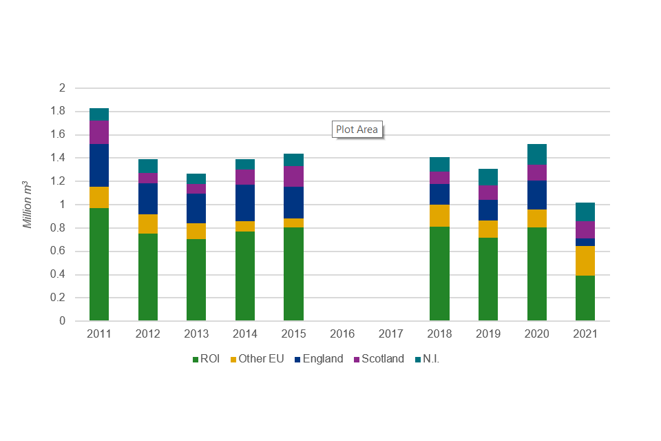 Figure 5 illustrates that the volume of peat imported from Ireland decreased between 2020 and 2021 by 52%, whilst volumes from other EU nations increased by 66%. This change is likely to have arisen because Bord na Móna, the state-owned Irish peat-extractor, stopped peat extraction on its bogs in 2020.[footnote 50] It will continue to supply peat while it runs down its stockpiles, which are expected to last until 2024. As a result, manufacturers have increased imports from other nations, principally from the Baltic region.[footnote 51]