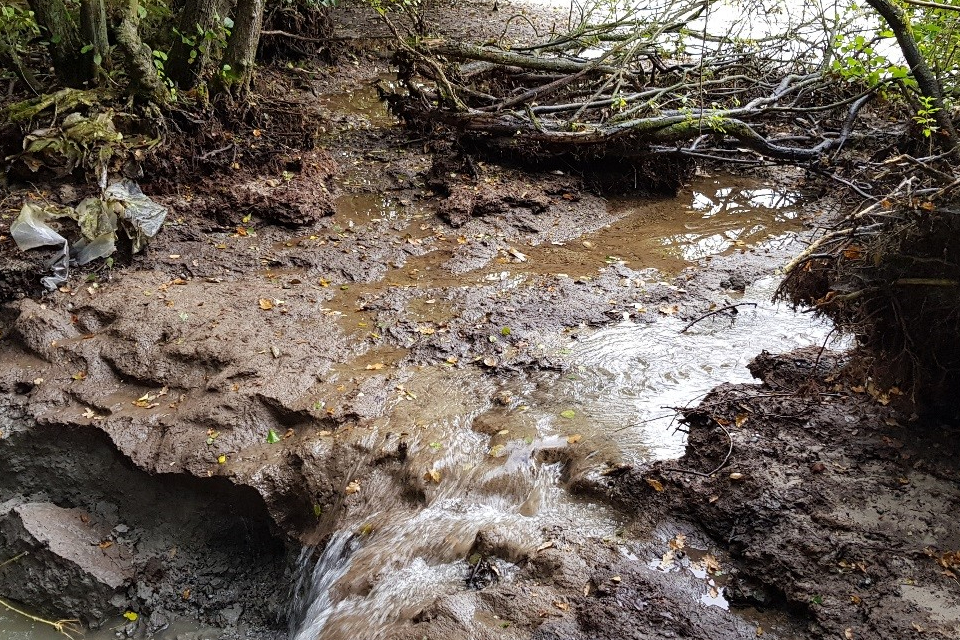 This incident occurred at a small flood storage reservoir. Following heavy rain, the reservoir filled. When nearing top water level, water started leaking at the base of the bank. This was flowing at approximately 12 litres per minute.