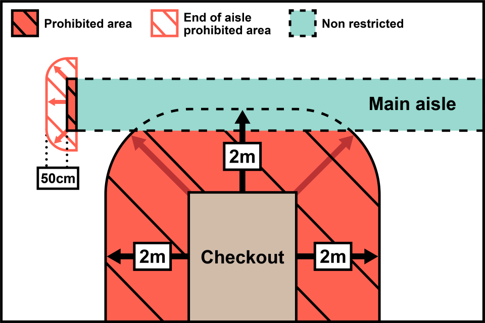 In the image above, the restricted area is within 2m of the checkout facility and specified foods cannot be placed here. This includes any point within 2m from a counter at which a cash register is used, including the area behind the counter and any point within 2m of the external surface of a till point, electronic point of sale or self-service checkout machine. This does not prevent specified food being placed in an aisle, even if it is within 2m of the checkout, but specified food should not be placed at the end of an aisle or within 50cm of the end of the aisle.