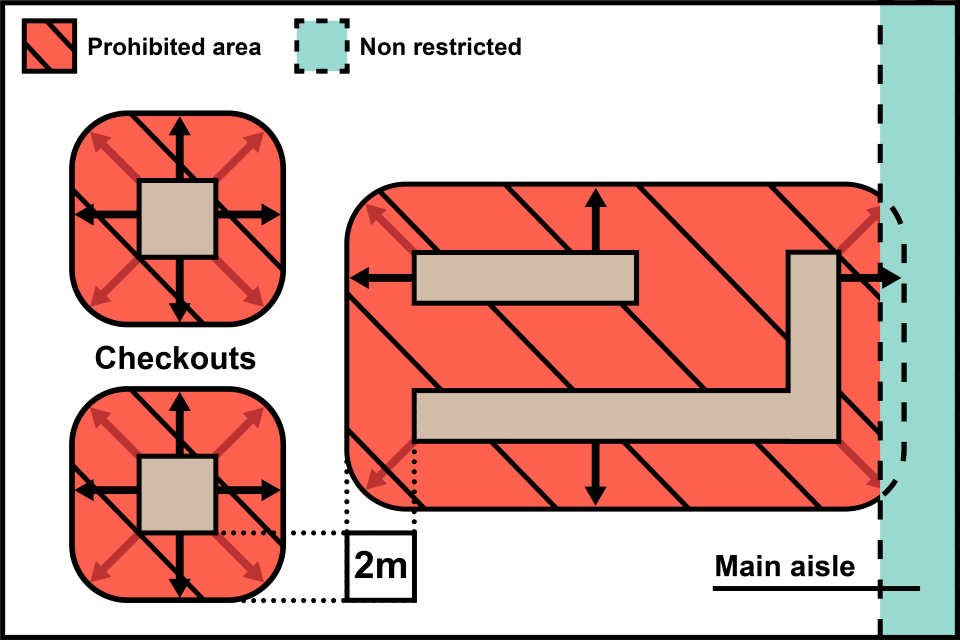 In the image above, the restricted area is within 2m of a designated queuing area or a queue management system and specified foods cannot be placed here. There is also a 2m prohibited area around the checkouts and specified foods cannot be placed here. This does not prevent specified food being placed in an aisle (but not at the end of an aisle) even if it is within 2m of the designated queuing area.