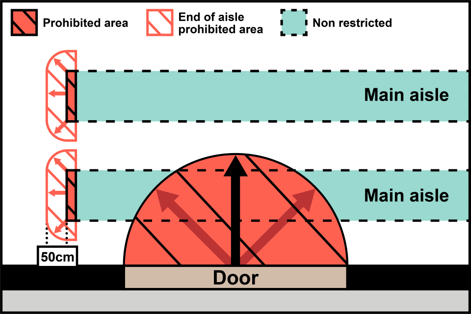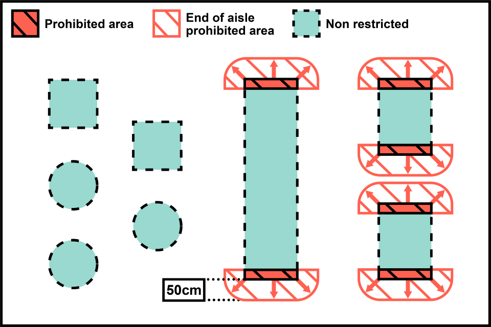 In the image above, the ends of aisles and within 50cm of the aisle end (but not in the main aisle) are restricted and specified foods cannot be placed here. Specified food can be placed on island-type structures that can be dotted around the store, which are not in scope of the restrictions as they are not aisles.