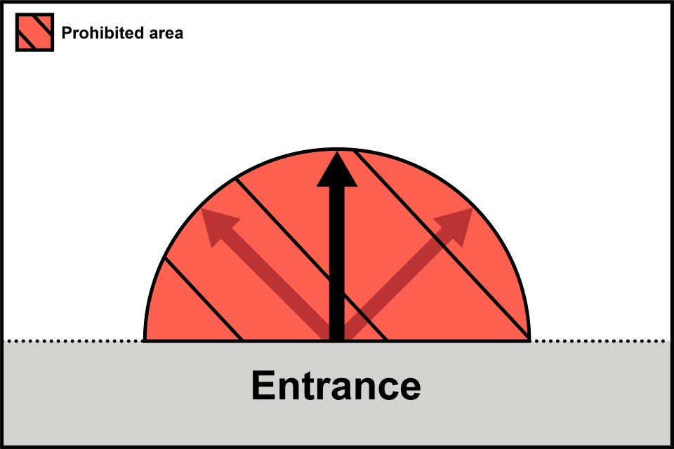 A single door entrance with the prohibited distance from the midpoint of the entrance within the store.