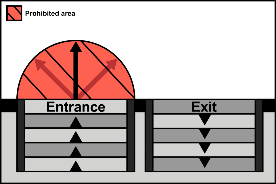 In the image above, stairs or escalators lead up to a single door entrance. The prohibited distance is from the midpoint of the entrance within the store.