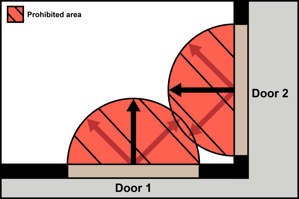 In the image above, there are multiple door entrances with the prohibited distance from the midpoint of each of the entrances within the store.