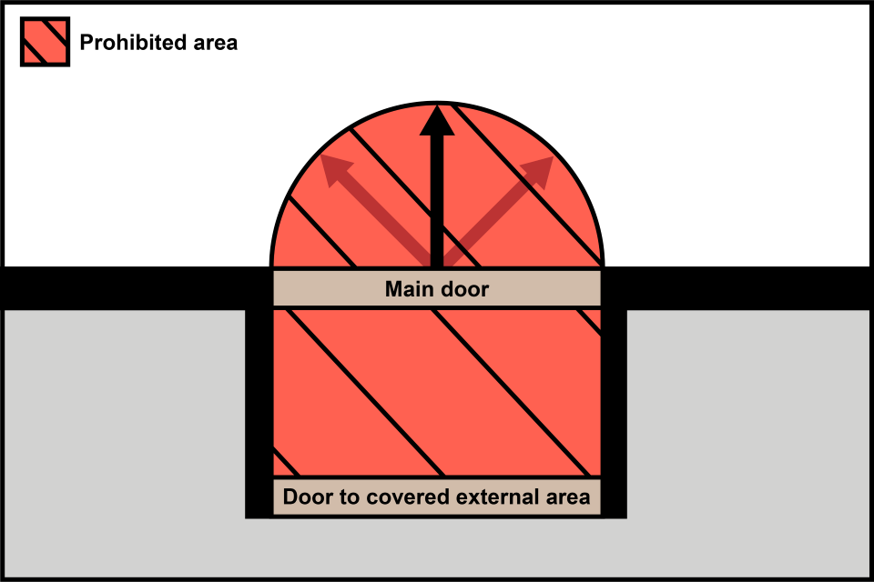 In the image above, there is an entrance with a covered area outside of the store through which the public passes to enter the main shopping area (for example, the foyer, lobby or vestibule). This area is restricted, as is the prohibited distance from the midpoint of the entrance within the store.