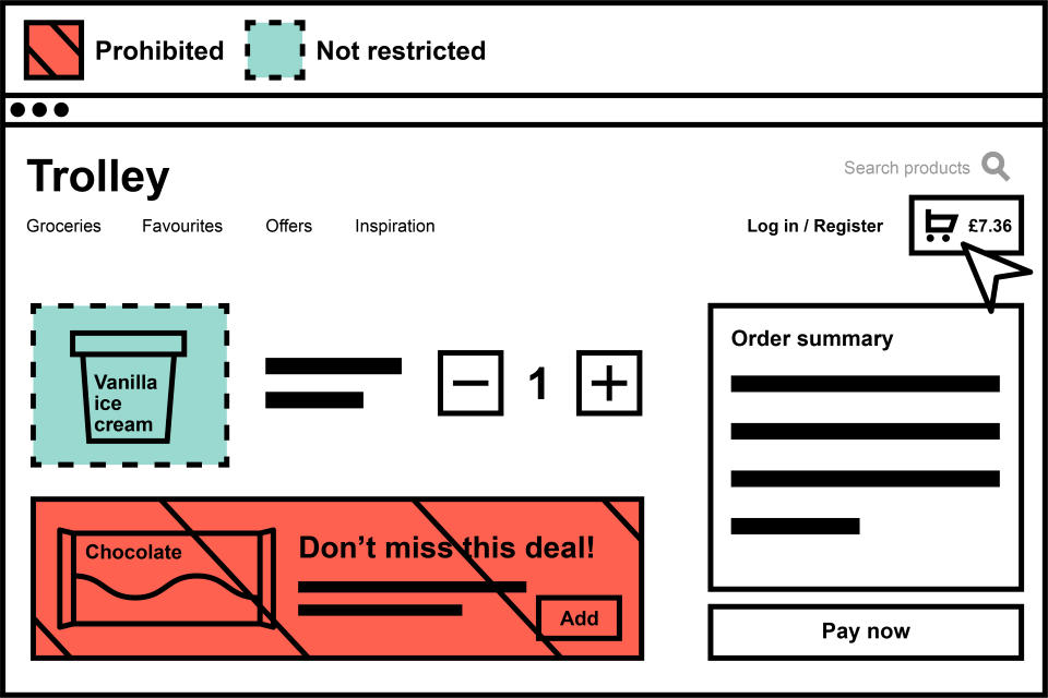 In the image above, there is a browsing page where the customer has opened the ‘crisps’ page. On this page, crisps are not prohibited even if they are HFSS as the consumer has navigated to this page. There is a banner for ice cream that is HFSS, which is restricted.