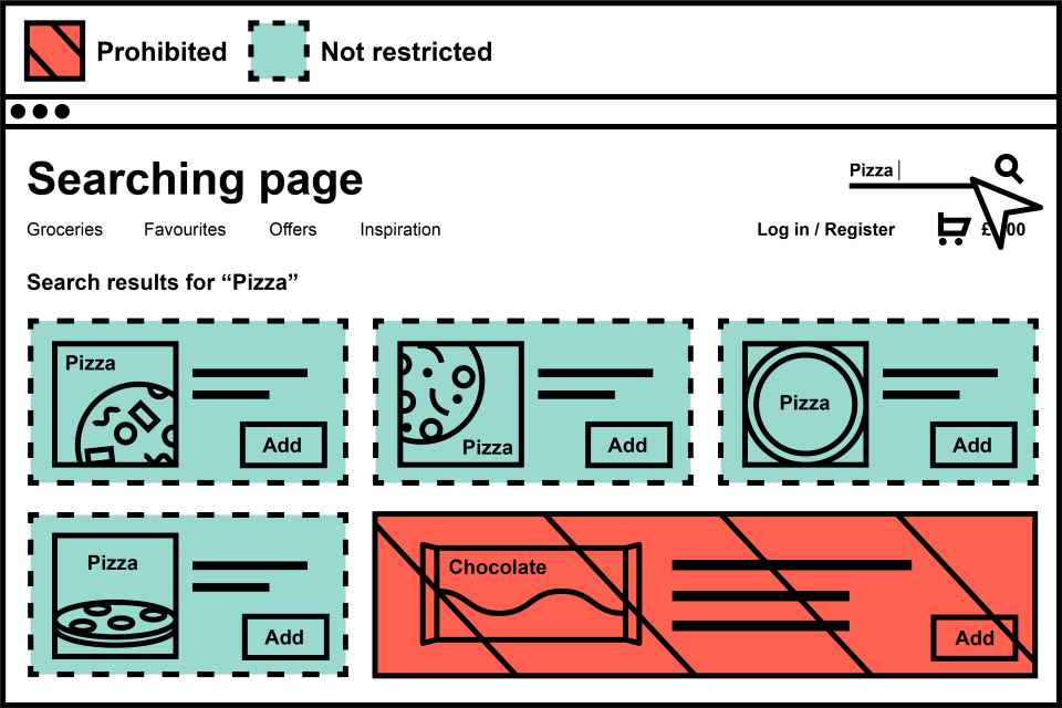 In the image above, there is a search page where the consumer has searched for ‘pizza’. All pizzas are not restricted even if they are HFSS as the customer has searched for pizzas. A HFSS chocolate is also shown on the page, which is restricted.