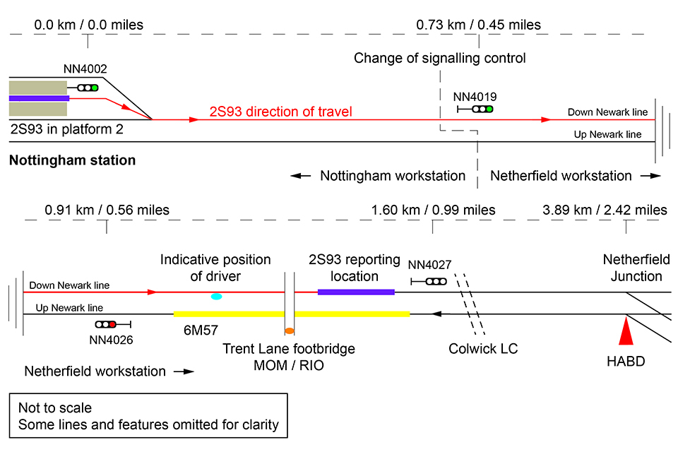 Diagram showing location of stopped train 6M57, and the route taken by train 2S93 once it departed from Nottingham. Also shown are the approximate location of the change of control between workstations and the location of HABD. Distances shown are relative between areas of interest.