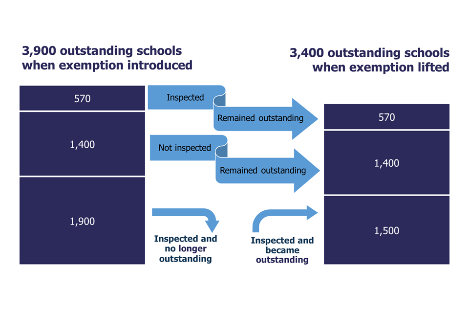 There were 3,900 outstanding primary and secondary schools when the exemption was introduced, and 3,400 were outstanding when it ended. Although these numbers are similar, the composition of the list changed substantially during those 8 years. There were 1,400 schools that remained outstanding throughout the period because they were not inspected at all and so kept their grade, and 570 that were inspected but remained outstanding. About 1,900 schools ceased to be outstanding (usually after an inspection triggered by a risk assessment) and 1,500 additional schools were judged outstanding.