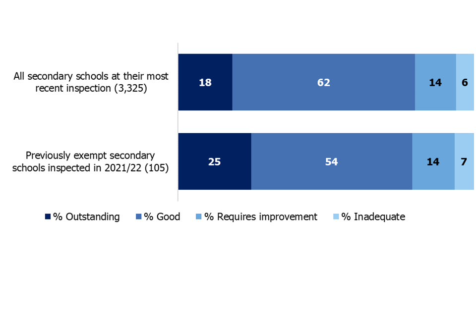 Twenty-one per cent of the previously exempt secondary schools that had a graded inspection in 2021/22 were judged to require improvement or to be inadequate. Twenty per cent of all open secondary schools received a grade of requires improvement or inadequate at their most recent inspection.