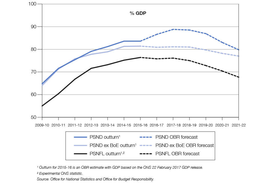 ‘Public sector finances’, ONS, January 2017, and ‘Economic and fiscal outlook’, OBR, March 2017. ↩