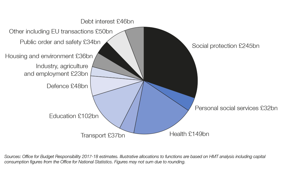 Chart 1 shows public spending by main function. Total Managed Expenditure is expected to be around £802 billion in 2017-18.