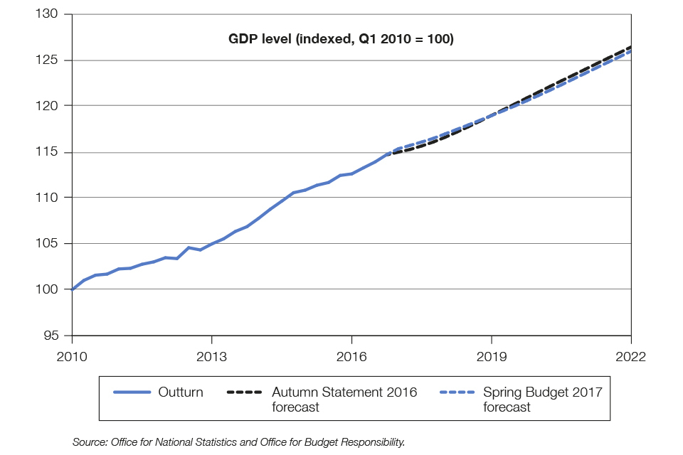 The OBR’s Spring Budget 2017 forecast for the level of GDP at the end of 2021 is broadly unchanged from Autumn Statement 2016, although the expected profile of growth has been revised. The OBR now forecasts stronger GDP growth in 2017 than previously expected, as a result of stronger economic data over the past few months; in particular, consumption growth has been stronger than anticipated. However, in the near term, rising inflation, largely caused by the post-referendum sterling depreciation, is expected to weigh on household consumption growth. The OBR also continues to judge that business investment will be constrained due to economic uncertainty over the next few years. These effects combine to give a shallower, but slightly longer period of slower growth. Over the medium term, the OBR has not materially changed its main judgements about the economic outlook and its expectation for potential output growth over the next five years is therefore unchanged.