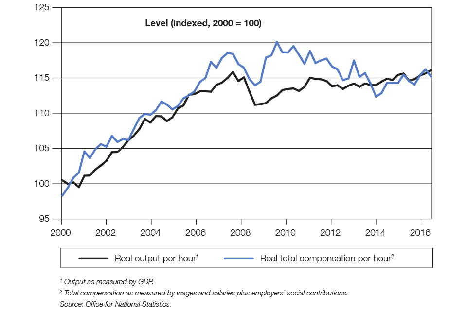 UK labour productivity growth was subdued in 2016, continuing to reflect the trends observed in most advanced economies since the financial crisis. Output per hour increased 0.4% in Q4 2016, in line with the average quarterly growth across the year as a whole. Raising productivity growth sustainably remains the central long-term economic challenge facing the UK.