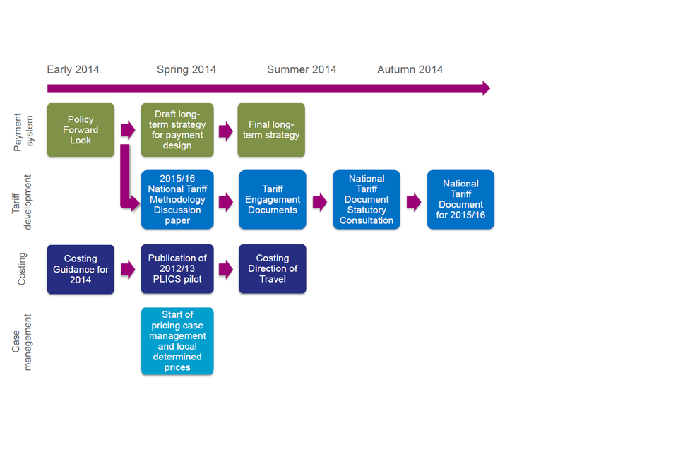 A timeline showing how Monitor and NHS England are working with the sector in 2014/15 to develop the NHS payment system.