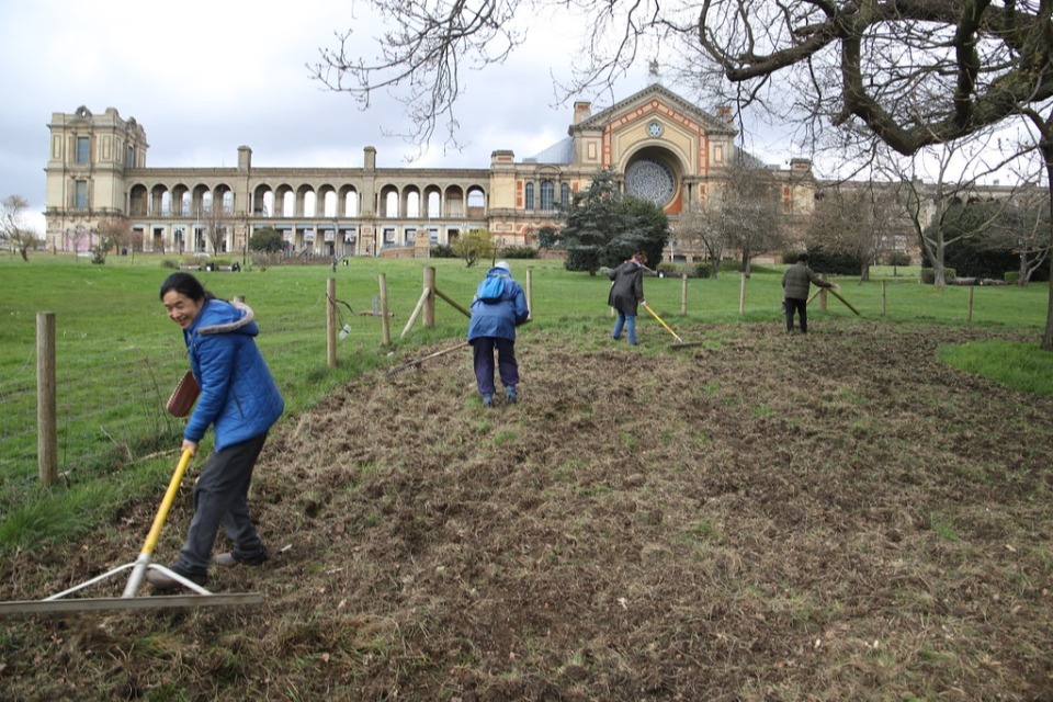 Local residents prepare the ground to sow seeds for a wild flower meadow at Alexander Park Palace. Crown copyright 2024.