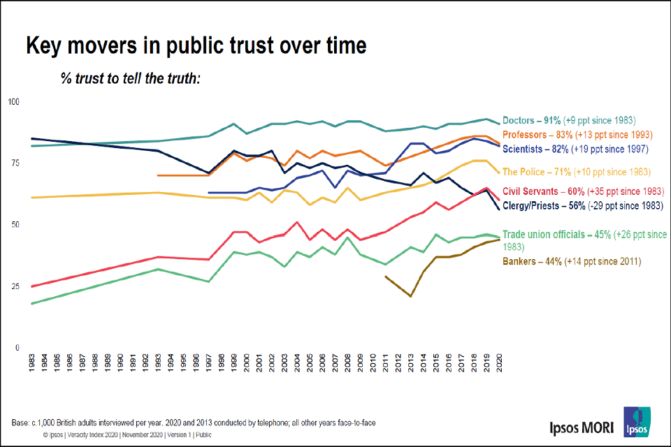 The Ipsos MORI Veracity Index is the longest-running poll on trust in professions in Britain, having been asked consistently since 1983. Percentage trust to tell the truth has remained consistently highest for doctors and there have been significant increases for professors and scientists since the 1990s and for civil servants since the time series began. The biggest fall in public trust since 1983 has been for clergy or priests, but 56% of people in the 2020 survey still trusted them to tell the truth.