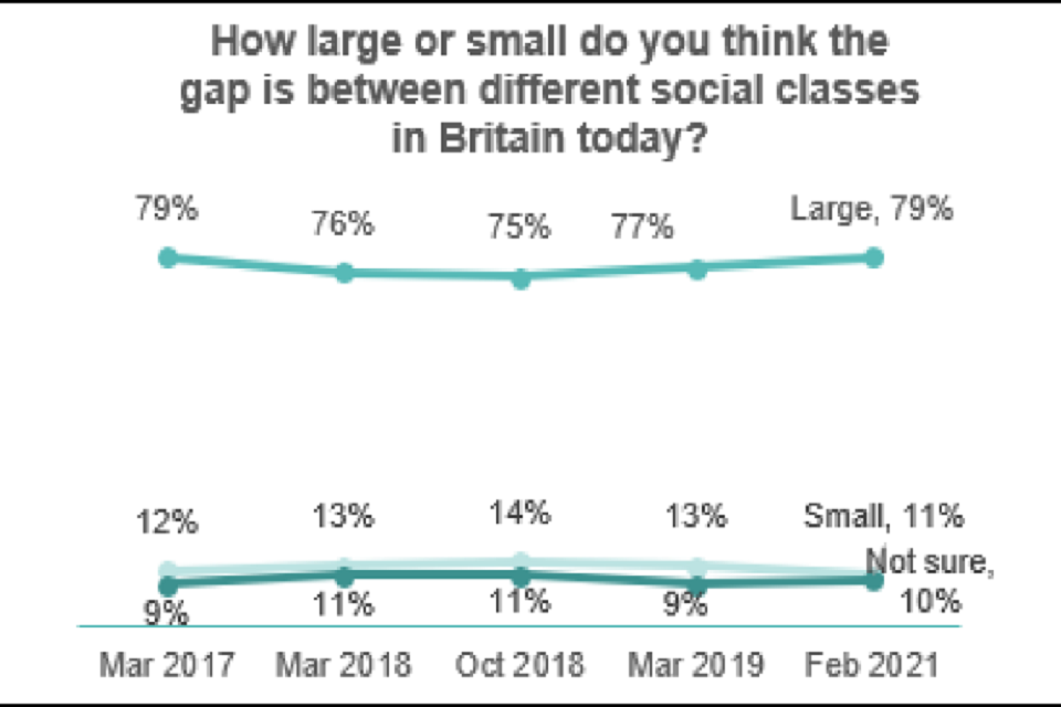 line diagram from March 2017 to February 2021 showing peoples answers to how large or small they think the gap is in social classes.
