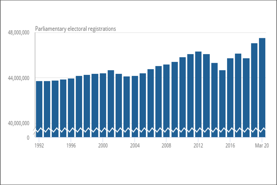 As of 2 March 2020, there were 47.6 million Parliamentary electoral registrations in the UK, the highest number ever recorded.