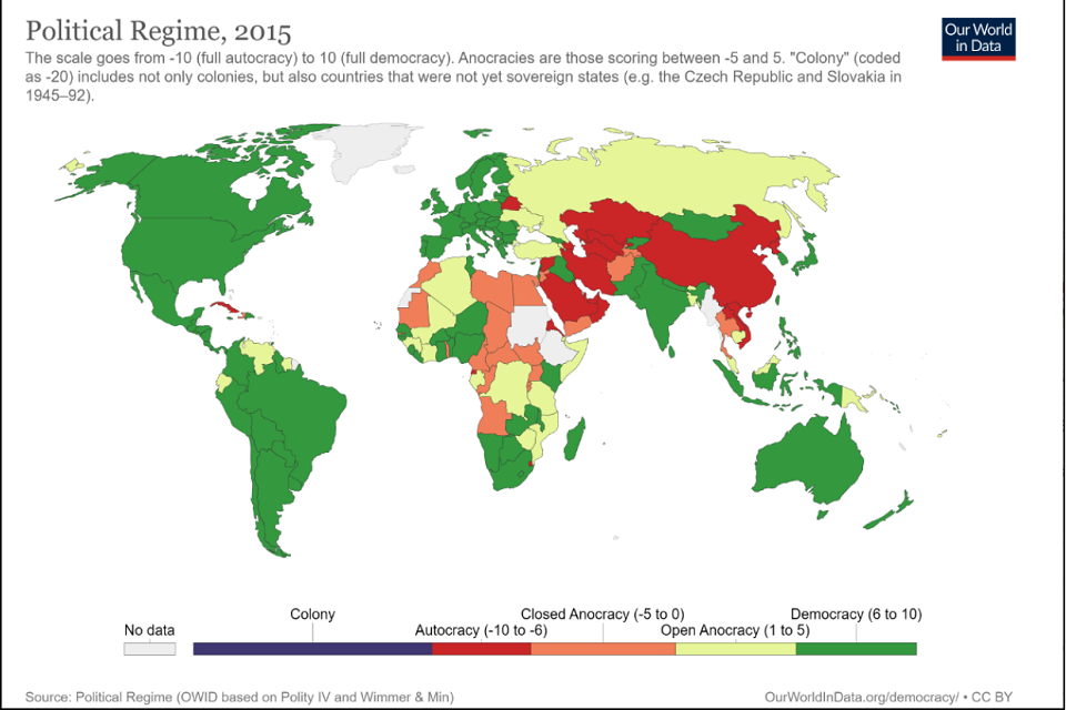 Map of the world showing countries with grey - no data, blue a colony, red an autocracy, orange a closed anocracy, yellow an open anocracy and green a democracy.