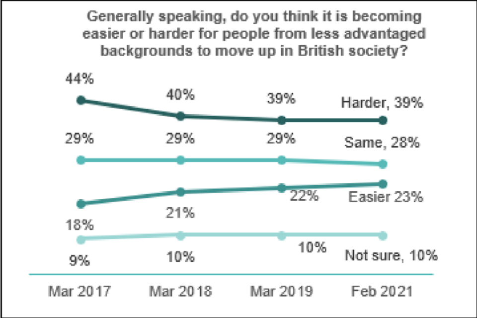 line diagram from March 2017 to February 2021 showing peoples answers to how easy or hard it is to move up in society from a less advantaged background.