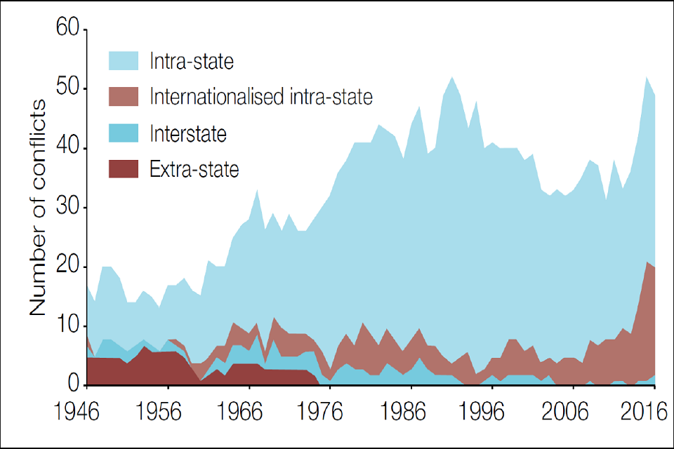 Chart of conflicts between 0 and 60 over the time period 1946 to 2016. Dark brown shows extra-state conflict, mid blue interstate, light brown internationalised intra-state and light blue intra-state.