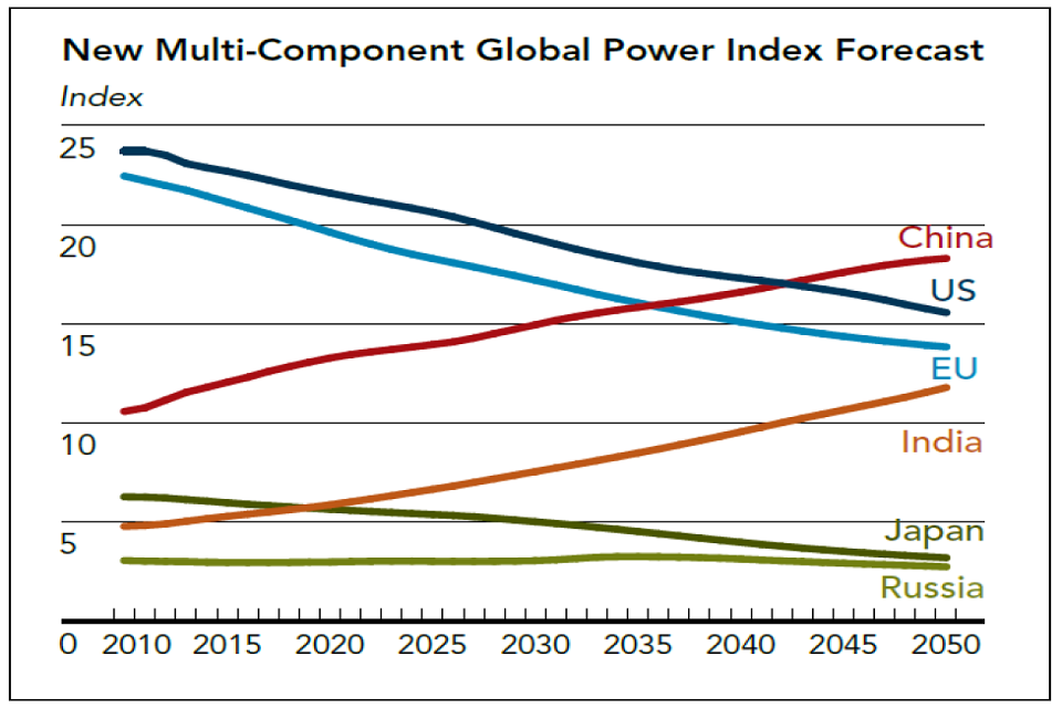 Line graph of a power index from 0 to 25 over the time period 2010 to 2050. Russia is shown as a light green line, Japan - dark green, India - orange, EU - light blue, US - dark blue and China a red line.