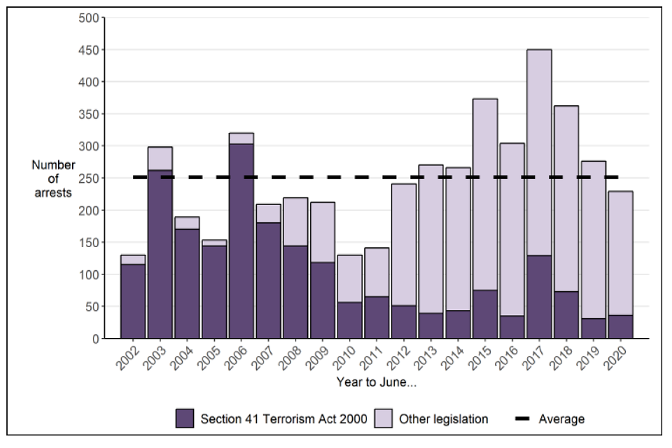 In the year ending 30 June 2020, there were 229 arrests for terrorist-related activity in Great Britain, 47 fewer than the previous 12-month period (a fall of 17%). This was the lowest number of arrests for terrorist-related activity in the last nine years and is below the annual average of 251 arrests over the time series 2002 to 2020.