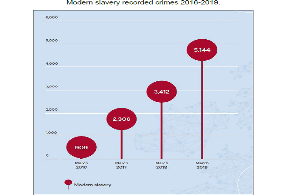 The number of modern slavery crimes recorded by police forces in England and Wales in the year ending March 2017 was 2,306 compared to 5,144 modern slavery crimes recorded in the year ending March 2019 – a 123% increase.
