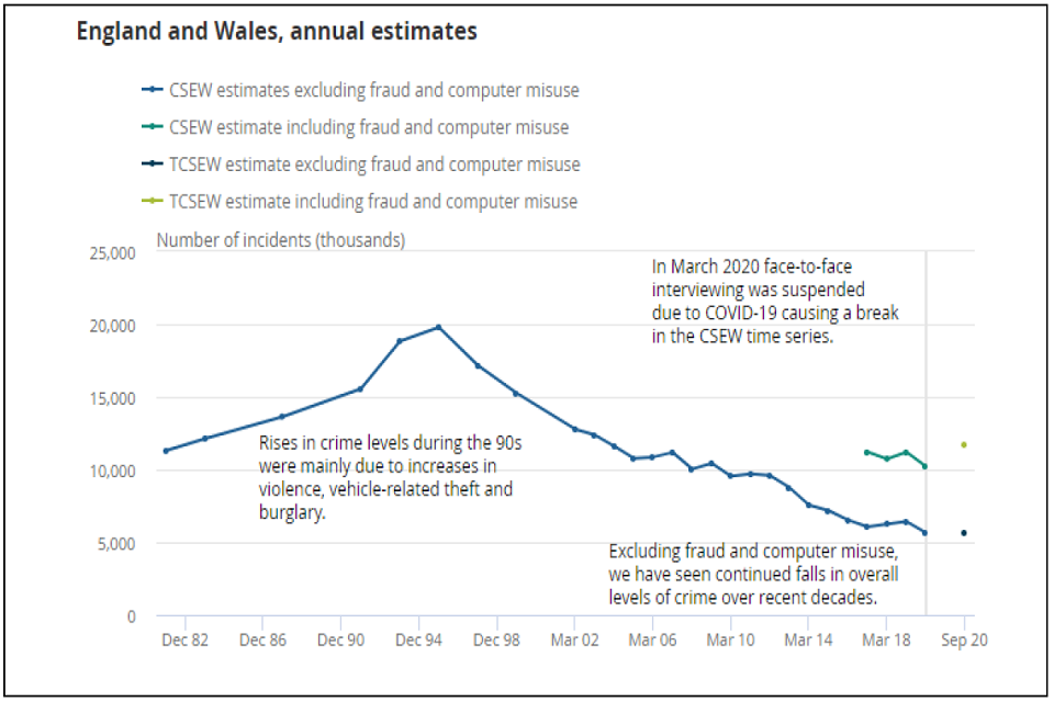 Since the mid-1990s, the Crime Survey for England and Wales has recorded long-term falls in overall crime estimates. The police recorded 5.7 million crimes in England and Wales in the 12-month period to year ending September 2020, a 6% decrease from the previous year. The annual decrease was driven by substantial falls during the April to June 2020 period. This reflects the increase in time people spent at home under national lockdown restrictions due to the coronavirus (COVID-19) pandemic.