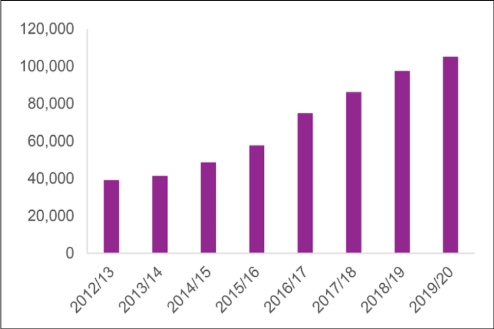The true scale and cost of modern slavery is unknown. The Centre for Social Justice believes there could be at least 100,000 victims in the UK, with the actual number likely to be even greater. Since 2017, the number of suspected victims identified and referred to the National Referral Mechanism has more than doubled. There were 10,627 referrals in 2019 compared to 5,145 referrals in 2017.