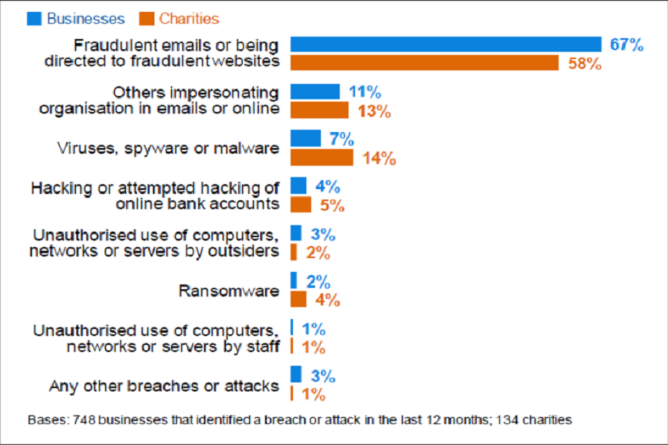 The nature of cyber attacks has changed. There has been a rise in phishing attacks (from 72% to 86%) and a fall in viruses or other malware (from 33% to 16%).