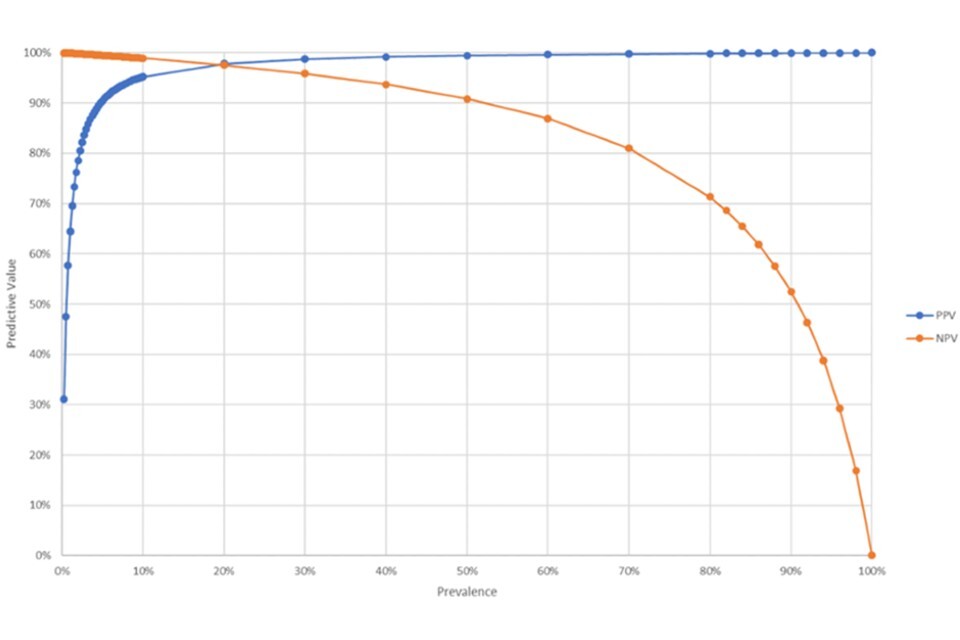 The positive predictive value (PPV) declines quickly, and in a non-linear way at low prevalence, and the negative predictive value declines quickly, again in a non-linear way, at high prevalence. The curves in Figure 1 below are illustrative of the likely performance of a PCR based test.