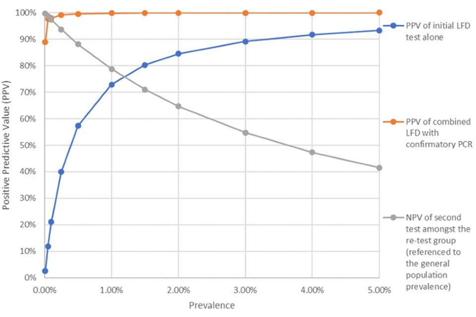 If it is assumed that both LFD and PCR tests perform as expected, the predictive value of these tests is dependent on the prior probability that disease is present, that is the prevalence of infections in the pool of people being investigated.
